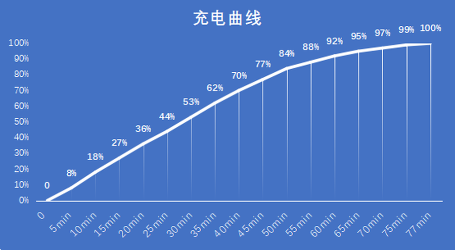 Redmi10XPro配备了4520毫安时的大容量电池,支持33WPD快充,经过测试,手机从0-100%共充电77分钟。在前55分钟手机的充电效率是比较不错的,只需30分钟即可冲入53%的电量。