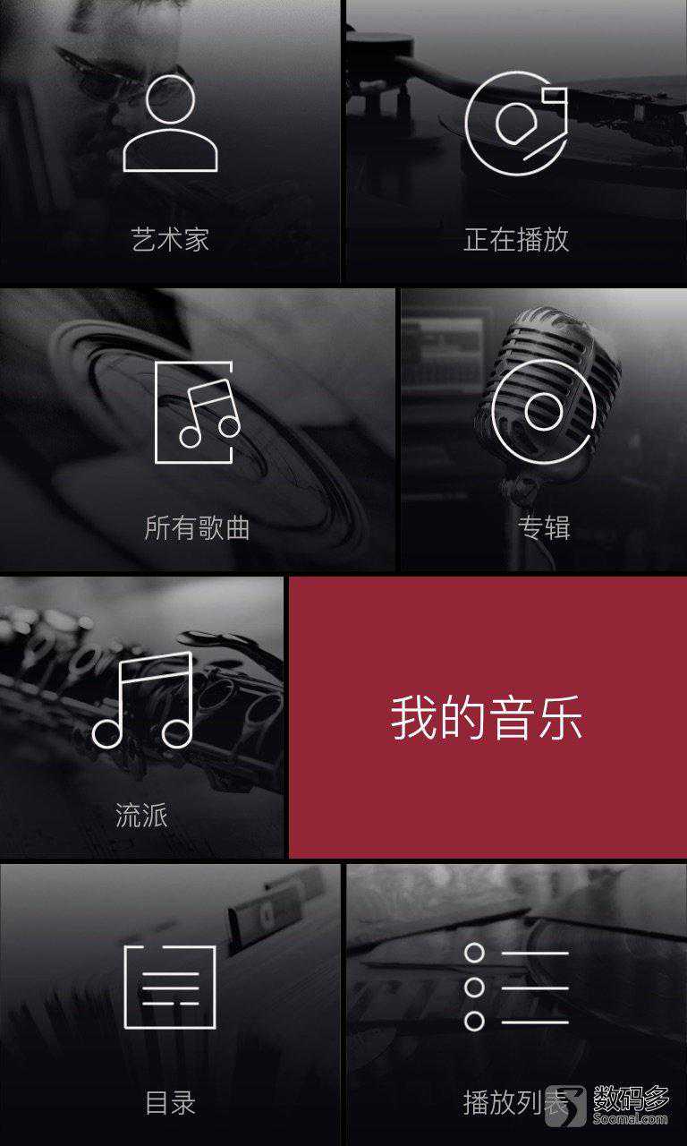 在音乐播放界面下,iBasso一直使用屏幕边沿触发的方式切换功能菜单。就是说手指从屏幕边沿外向内滑动来触发菜单。在播放主界面下,左往内滑动是进入了曲库管理相关界面;而右往内滑动是进入了播放相关参数设置界面。曲库界面如图所示,不做说明。