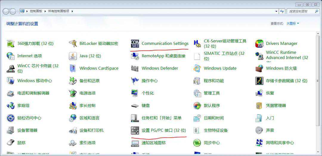 控制面板里除了PG/PC接口,还有一个通讯设置,请看下图。