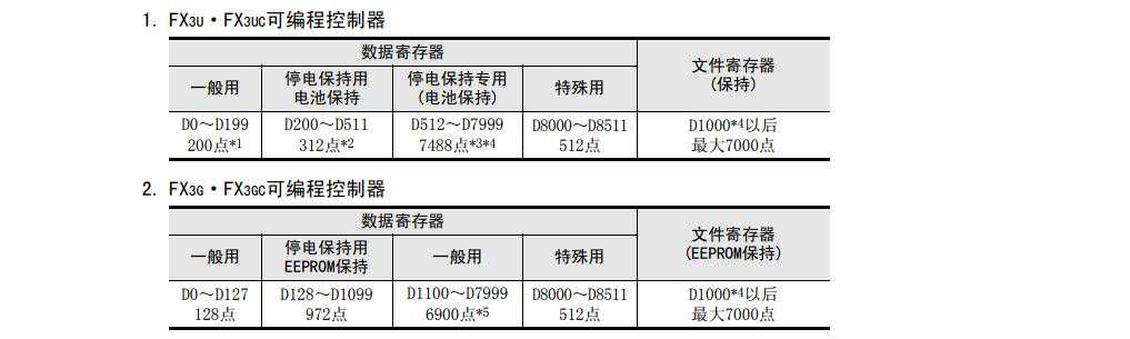 •停电保持(保持)用数据寄存器,在RUN/STOP以及停电时都保持其内容。FX3U·FX3UC可编程控制器时,通过可编程控制器内置的电池执行数据寄存器的停电保持。FX3G·FX3GC可编程控制器时,通过可编程控制器内置的EEPROM执行数据寄存器的停电保持。使用选件的电池时,通过电池,对一般用数据寄存器的一部分执行停电保持。