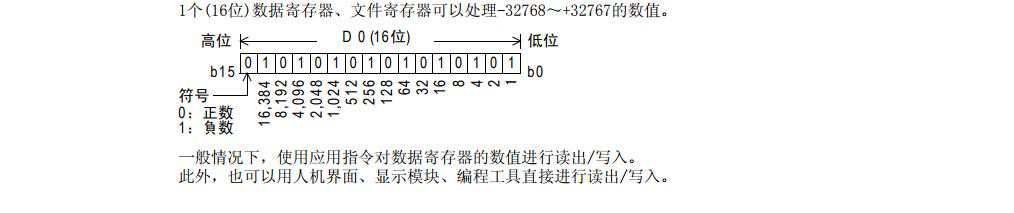 全都是16位数据(最高位为正负符号),将2个数据寄存器组合后可以保存32位(最高位为正负符号)的数值数据。