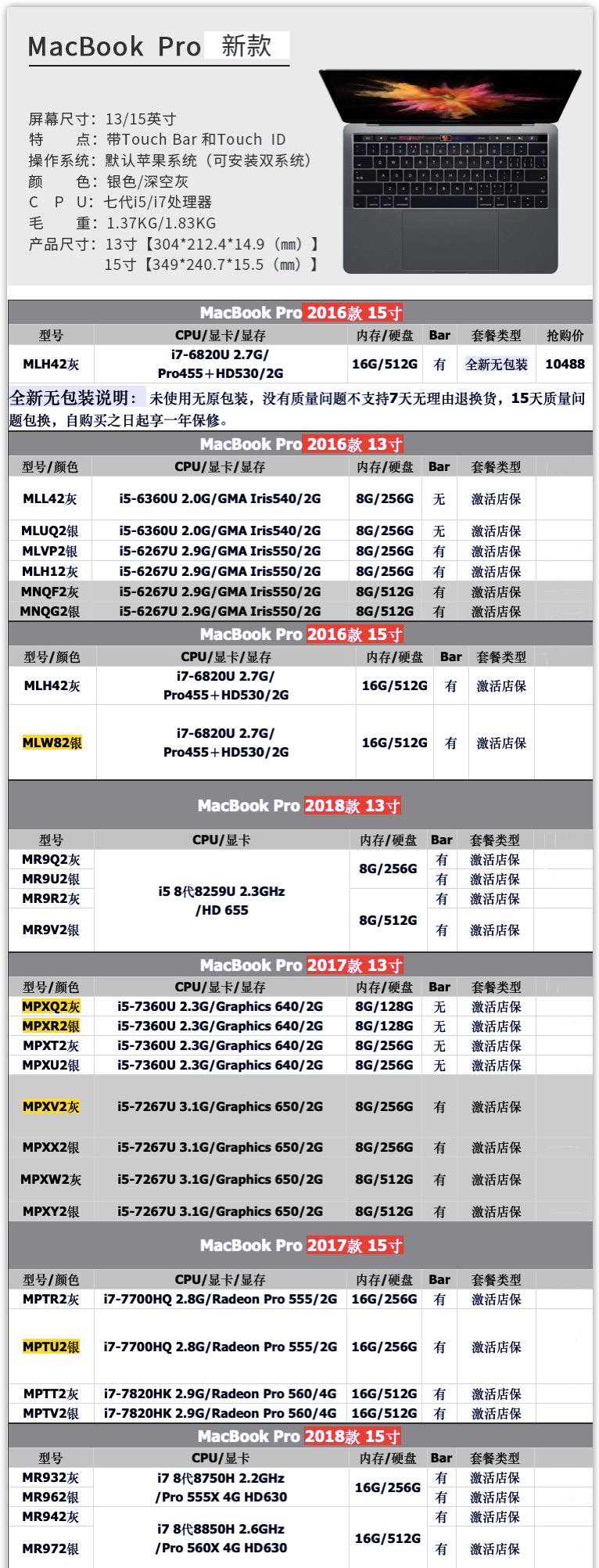 2.按产品年限说:第三代2013-2015年,第四代2016-2017年,2018年以后的苹果MacBookPro笔记本价格依然坚挺,13寸二手价格比新款便宜20%左右、15寸的二手价格比新款便宜30%左右,但即使折价出售也基本都在13寸6500上下,15寸10000上下,主要是因为2018年以后的MBP较老款性能升级幅度不小,在保修期内,新技术的应用、定制配置等。但是在某宝你要找对商家15000左右可以买到新款MBP16寸i7标准配置,全新国行,不带发票。