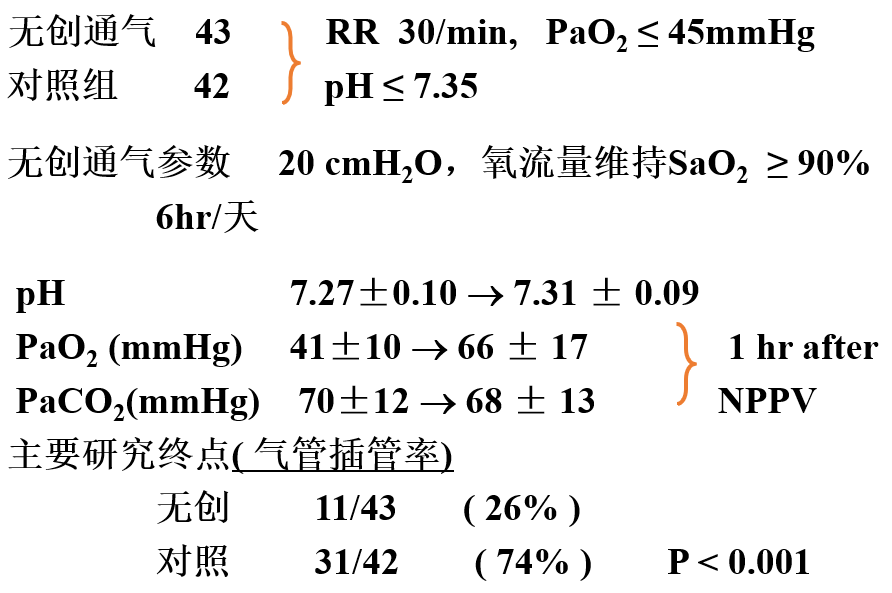 已经有不少前瞻性随机对照的研究结果显示,NIV可以降低AECOPD患者的气管插管率。下面引用1995年全球首个NIV治疗AECOPD的前瞻性随机对照研究的结果[1],NIV的应用使气管插管率从对照组的74%降低到NIV治疗组的26%()。