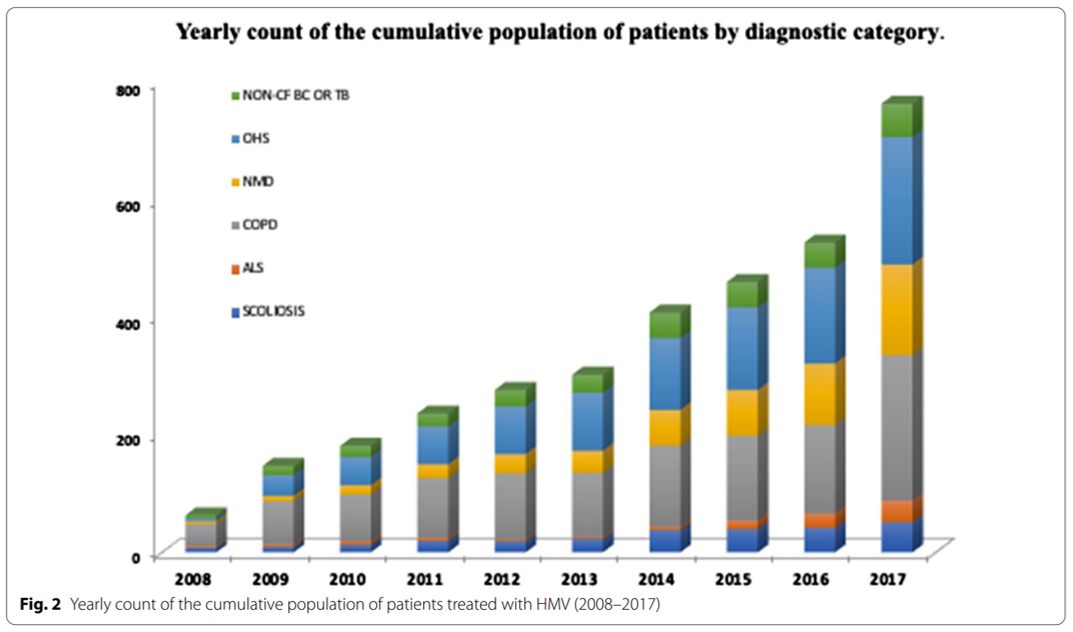 中国香港地区的一项回顾分析研究,对1047例长期家庭应用机械通气治疗慢性呼吸衰竭的患者进行了分析,其中95%患者使用NIV,5%患者使用了IMV,其中慢阻肺病是最常见的基础病[14]。