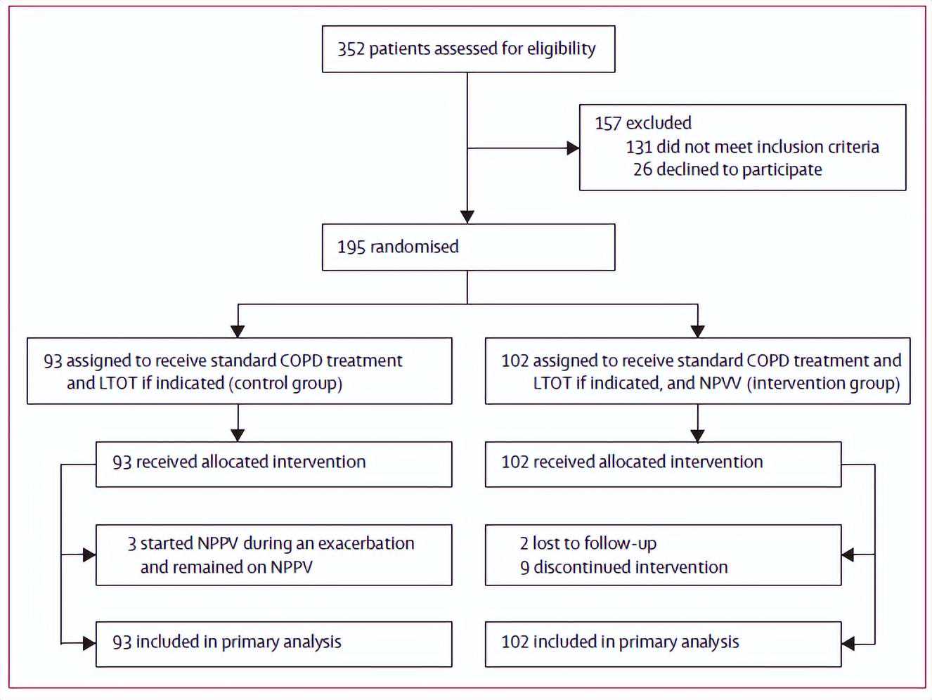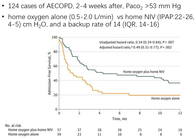 另外在《JAMA》上发表的另外一项家庭长期应用NIV治疗慢阻肺病合并慢性呼吸衰竭的研究,同样显示NIV可以降低随访一年的住院需求和病死率。其实际采用的平均IPAP达到22-26。这两项研究除了为长期家庭应用NIV治疗慢阻肺病合并慢性呼吸衰竭提供了证据以为,同时提示NIV参数设置可能对其疗效有显著的影响。未来应用NIV对慢阻肺病合并慢性呼吸衰竭患者进行长期的家庭康复治疗,需要重视方法学的问题。