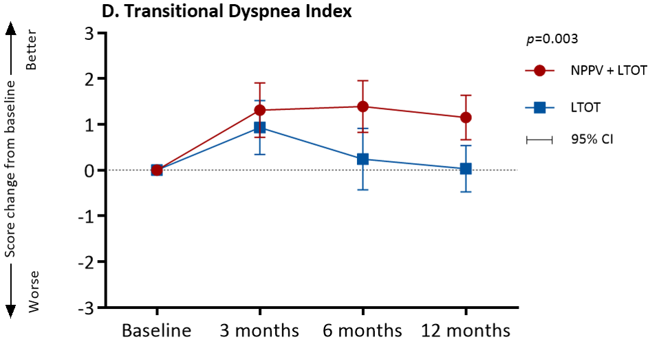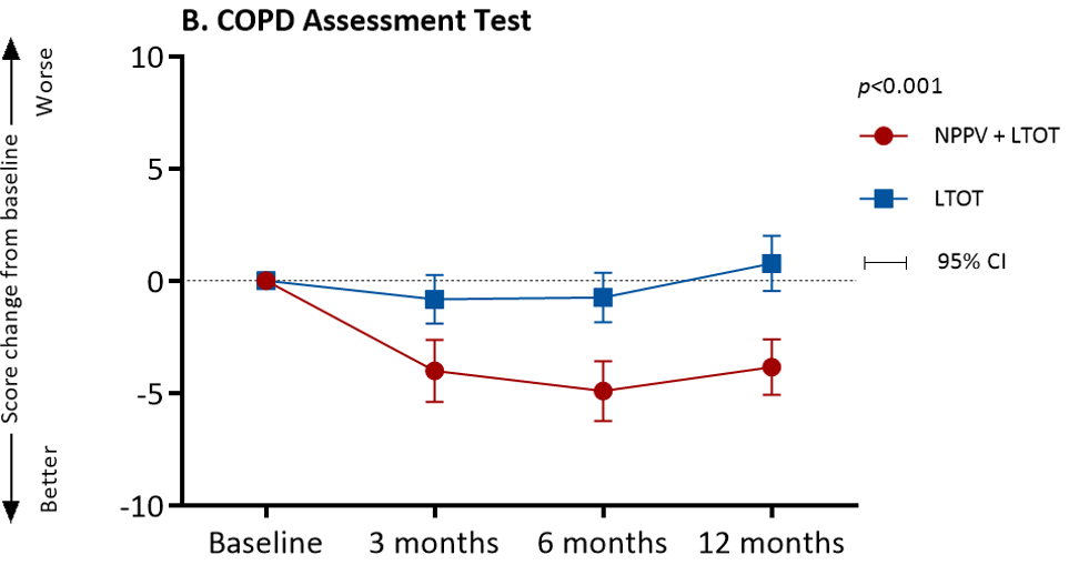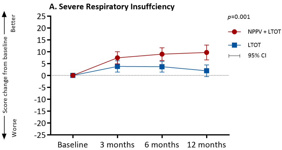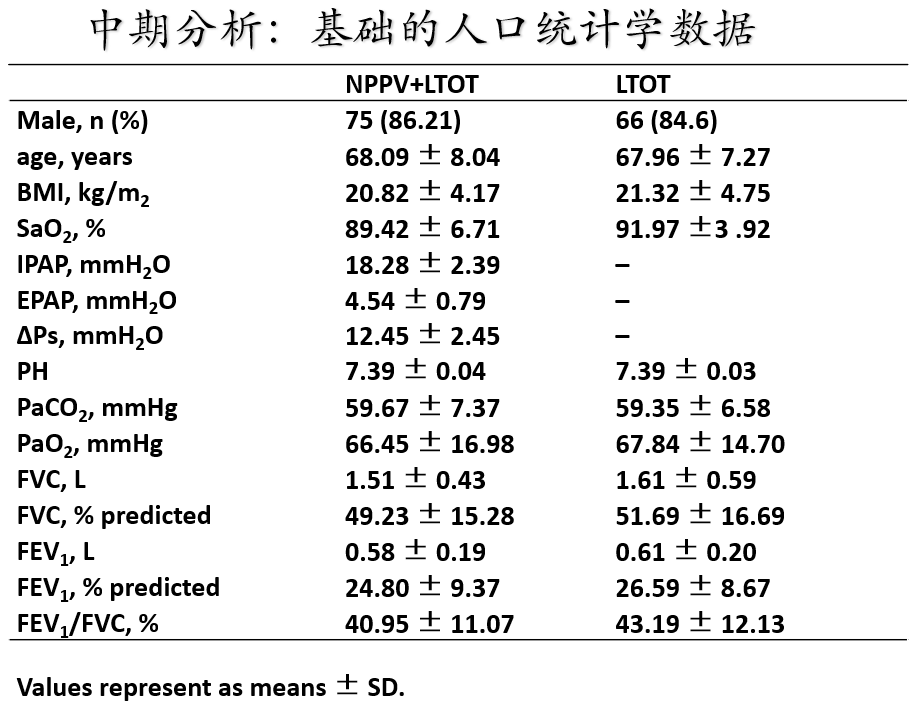 从中期数据分析来看,两组间的基线数据是没有统计学差异的,两组的白天PaCO2平均值均为59,NIV采用的IPAP平均为18cmH2O。NIV显著改善白天PaCO2,慢性呼吸衰竭患者生活质量(SRI)评分、症状评分(CAT)、呼吸困难(TDI)和急性加重频率。
