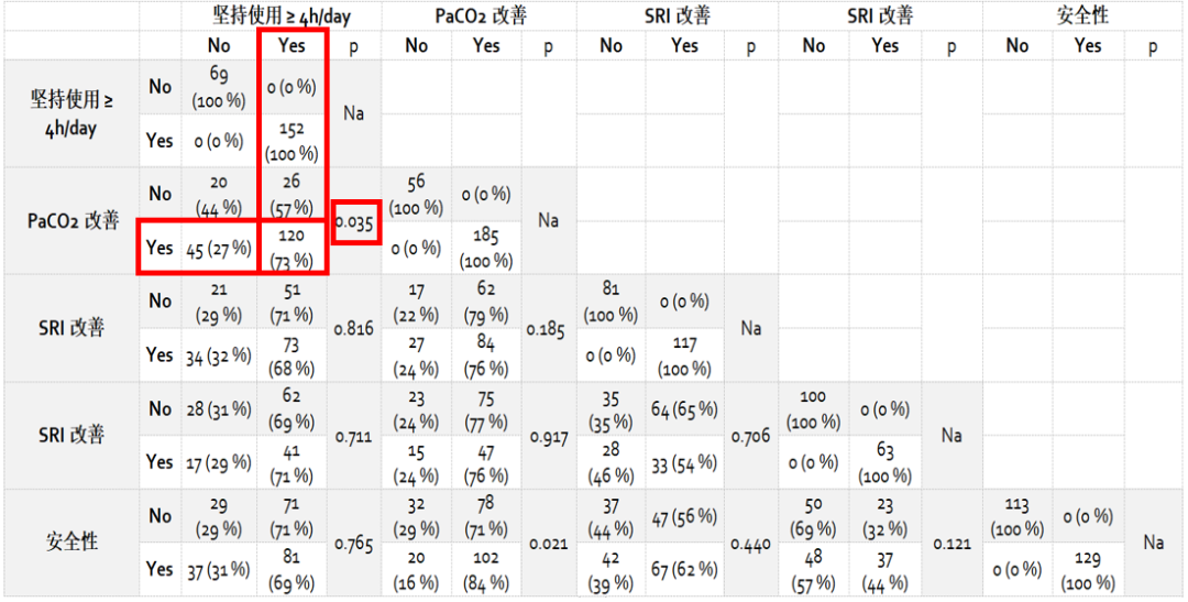 在这项研究中,对每天使用时间与效果之间进行了分析,发现依从性4小时/天的患者PaCO2改善的可能性更大,提示对NIV使用的依从性的重要性。