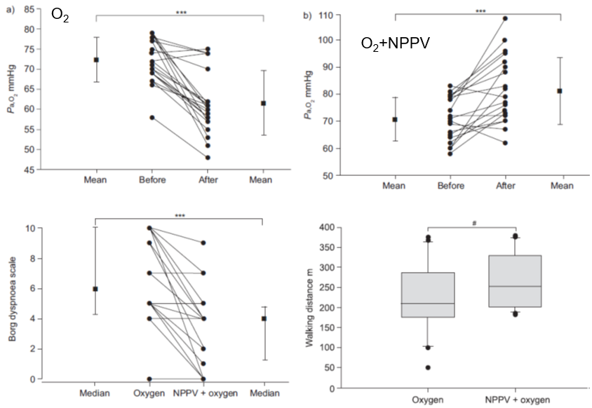 然而,慢阻肺病合并呼吸衰竭的患者的康复锻炼强度因为多种因素而无法达到足够的强度,这些因素包括患者疲劳、不愿意活动,呼吸困难的限制等。采用NIV辅助运动,是否可以增加运动强度和康复治疗的效果,是具有重要临床意义的问题。一项发表在ERJ上的前瞻交叉试验[20],选择已经接受长期NIV治疗的严重慢阻肺病患者,采用单纯「氧疗(2.1±0.9LPM)」与「氧疗+NIV(NPPV参数:IPAP:29,EPAP:4f:20)」进行对比,结果发现,NIV辅助步行,能够改善低氧血症、减轻气促、增加步行距离。