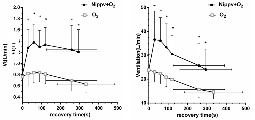 使用双管时不出现重复呼吸的问题,双管路NIV辅助慢阻肺病患者运动后呼吸困难缓解的效果比较好,运动结束点:NIV较O2治疗缩短119.81±54.53s()。