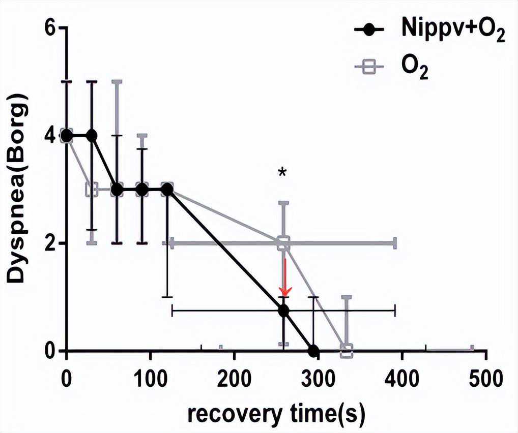 下方为呼吸困难评分随时间变化图,NIV+吸氧与单纯吸氧治疗比较,Borg评分下降1.0±2.0分(),而呼吸困难缓解总时间,联合治疗(294.4±133.8s)较单纯吸氧治疗(333.8±149.7s)有缩短趋势: