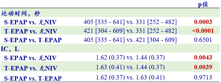 临床结局:平均PSV:12.0±1.5cmH2O,T-EPAP:4.0±1.0cmH2OS-EPAP与T-EPAP之间无明显差异NIV可延长运动耐受时间。