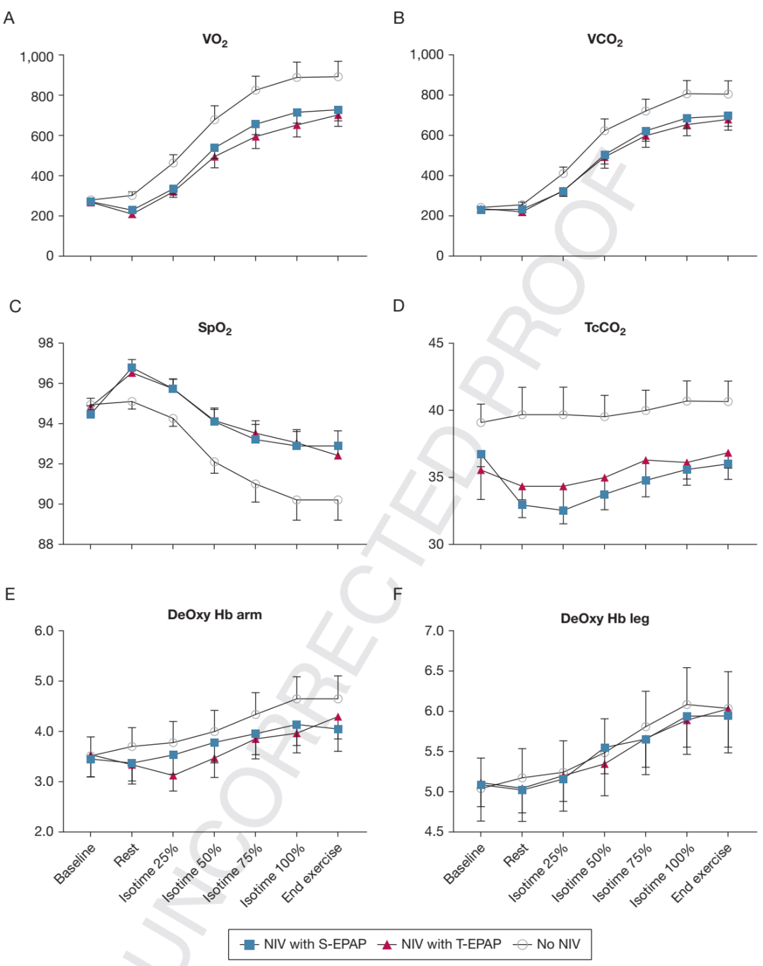 其他临床结局和结论:NIV改善运动过程的VO2、VCO2、SpO2、经皮CO2、以及脱氧血红蛋白;结论:NIV辅助COPD患者运动,1、降低DH和增加运动耐力时间;2、两周EPAP设置方法效果类似;3、双管路的NIV有望用于COPD辅助运动和康复。