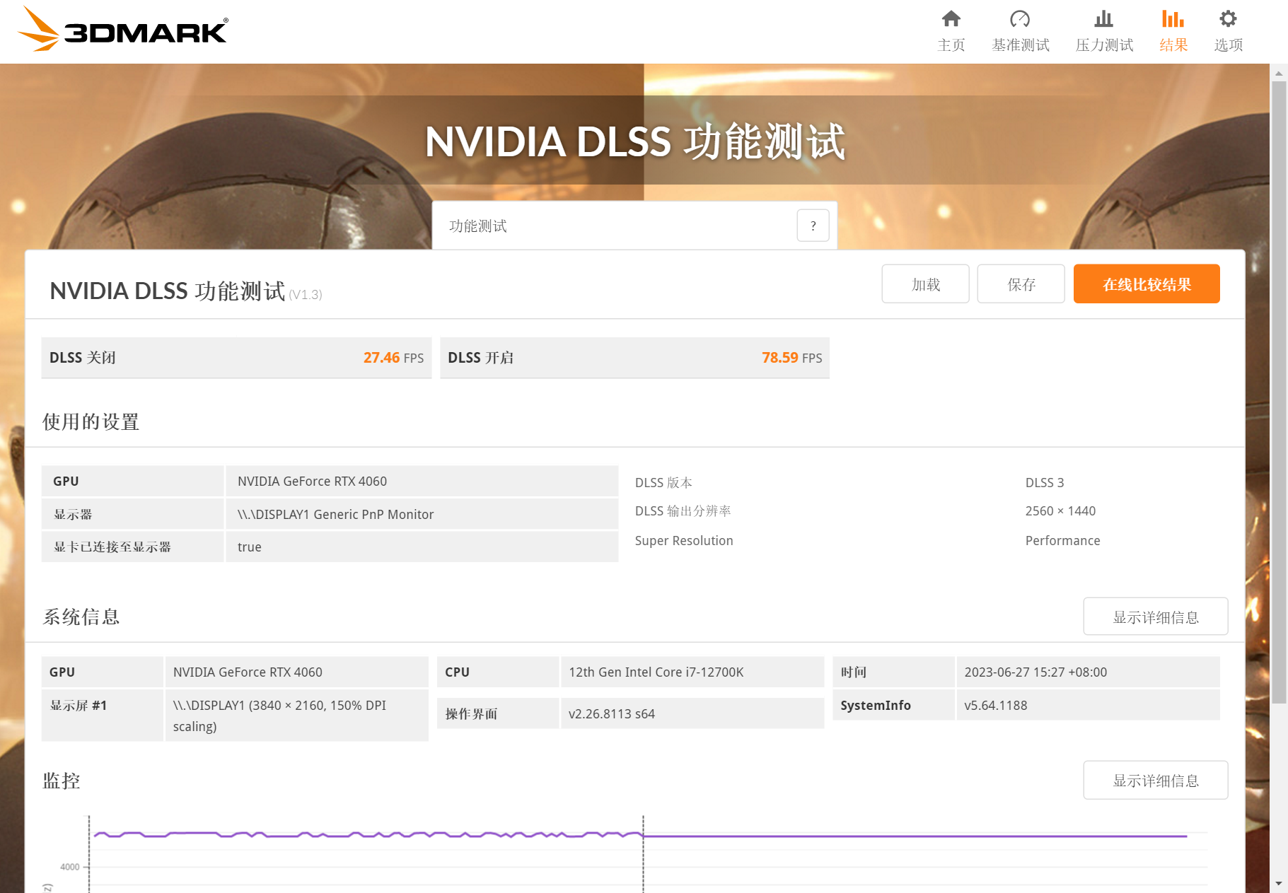 从3DMarkDLSS功能测试中就能很明显看到这一点,在2K分辨率中,COLORFIRERTX4060橘影橙8GB显卡借助DLSS3,能在2K分辨率下有78.59FPS的表现,提升了超过186%的性能。