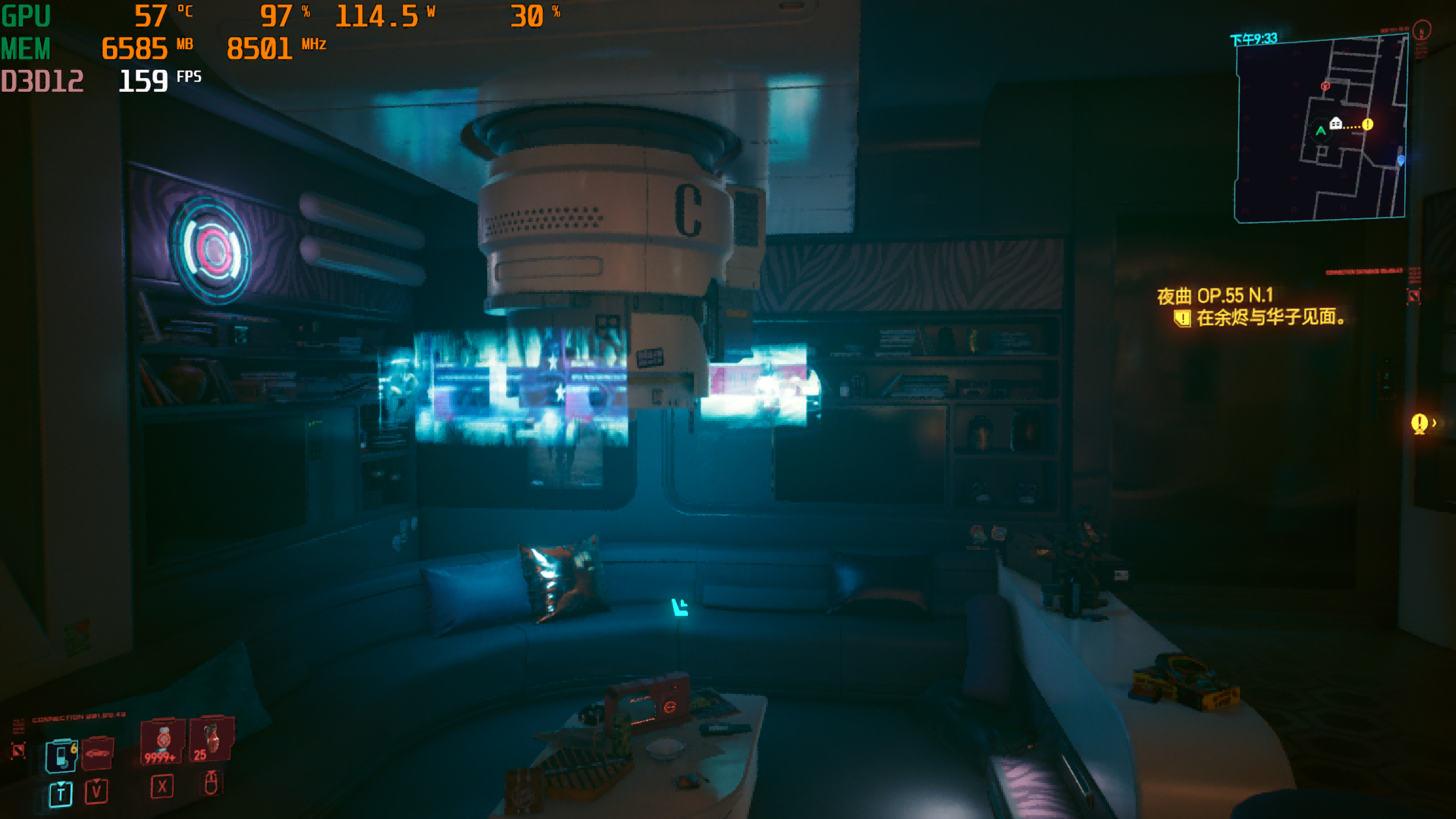 最后是《赛博朋克2077》,进入游戏看到实际帧率为159FPS,这是在1080P分辨率下得到的结果,可以说非常不错。