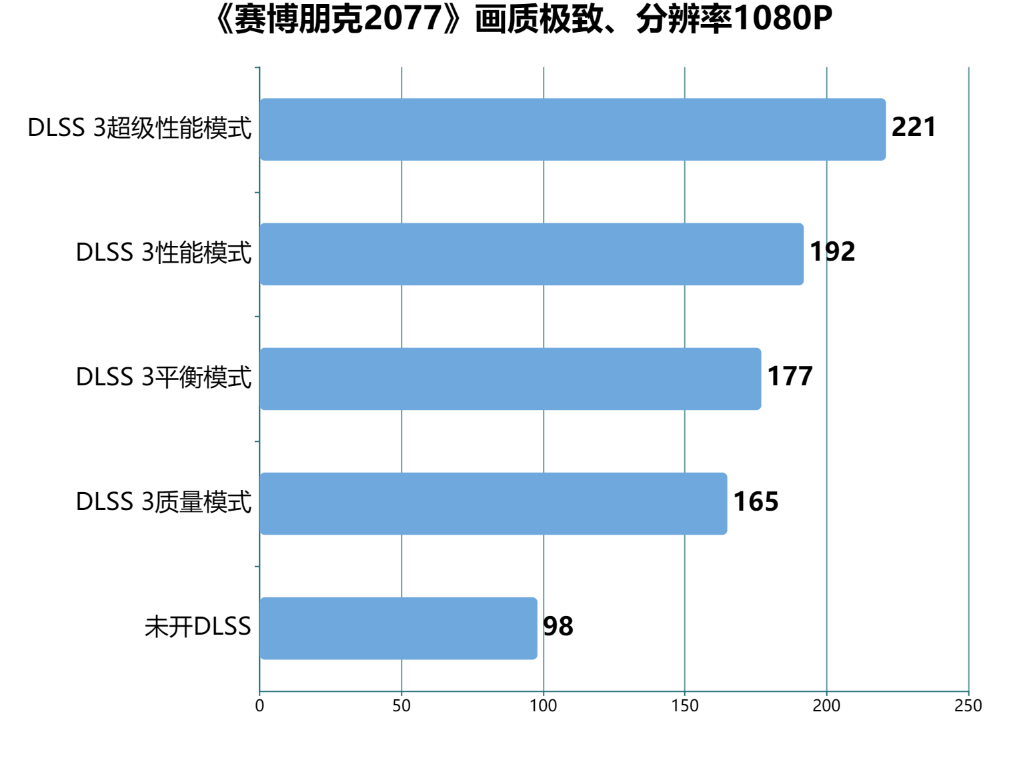 我们可以通过图表清晰看出DLSS3加持下给游戏的光追带来了多大的影响。DLSS3的质量模式就提升至近3倍的性能,DLSS3超级性能模式更是提升至接近4倍。