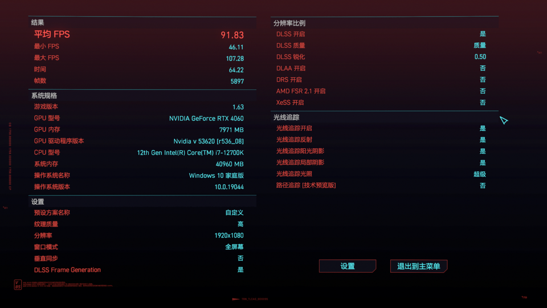 为了进一步看出RTX40显卡的性能,笔者还利用《赛博朋克2077》的基准测试,测试了开启光追情况下的帧率表现。由于RTX4060定位是中端显卡,因此以下数据均在1080P分辨率下来开启光线追踪(超级)。