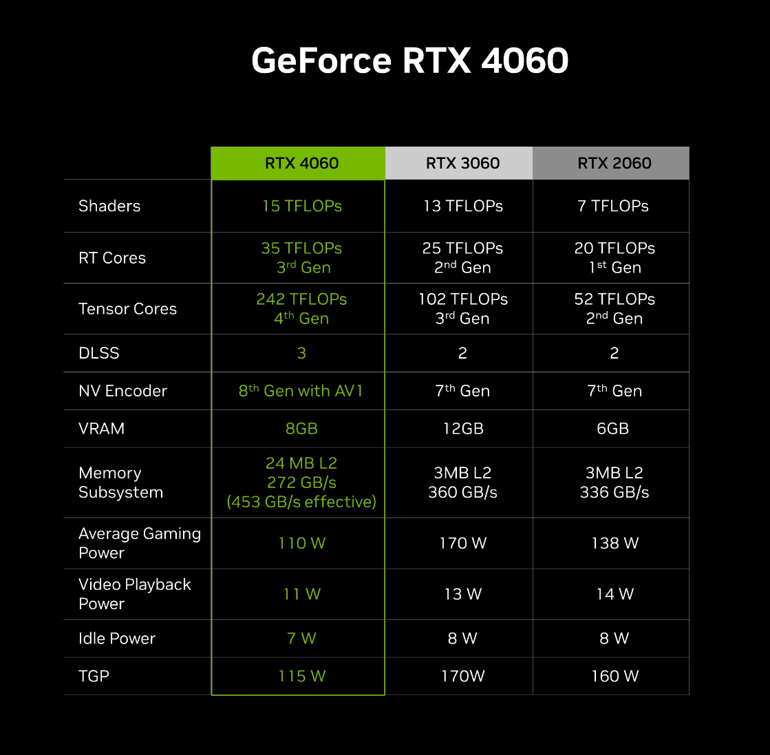 在与30系显卡以及20系显卡的对比上,RTX4060拥有更大的缓存,功耗更是降低到110W,以及使用了最新的DLSS3技术,这些都是30、20系列显卡无法抗衡的。
