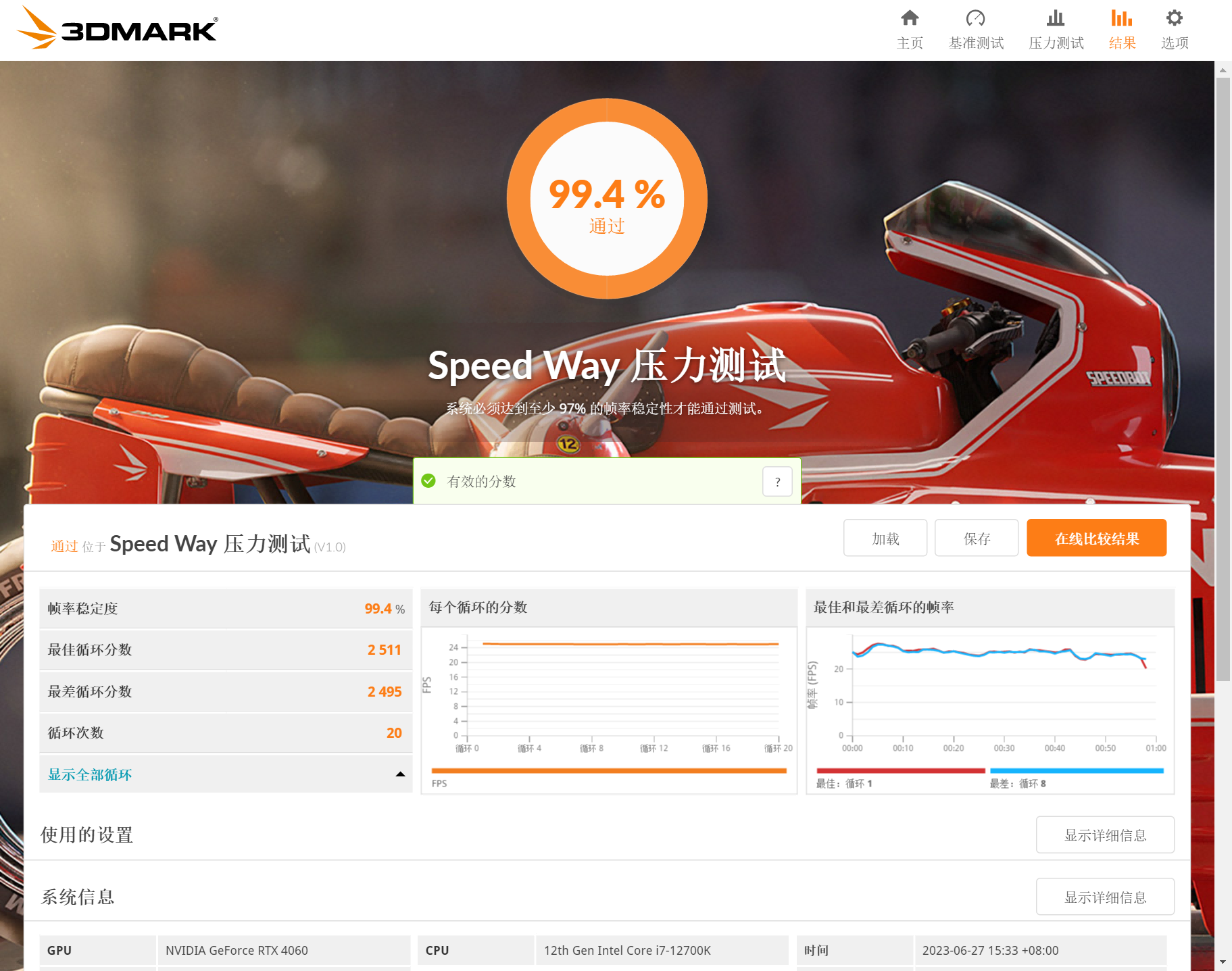 先进行3DMark压力测试,这个测试可以检测连续跑分下显卡性能会不会发生下降,一般97%以上才算合格的显卡。实测COLORFIRERTX4060橘影橙8GB的得分为99.4%,性能释放非常稳定。