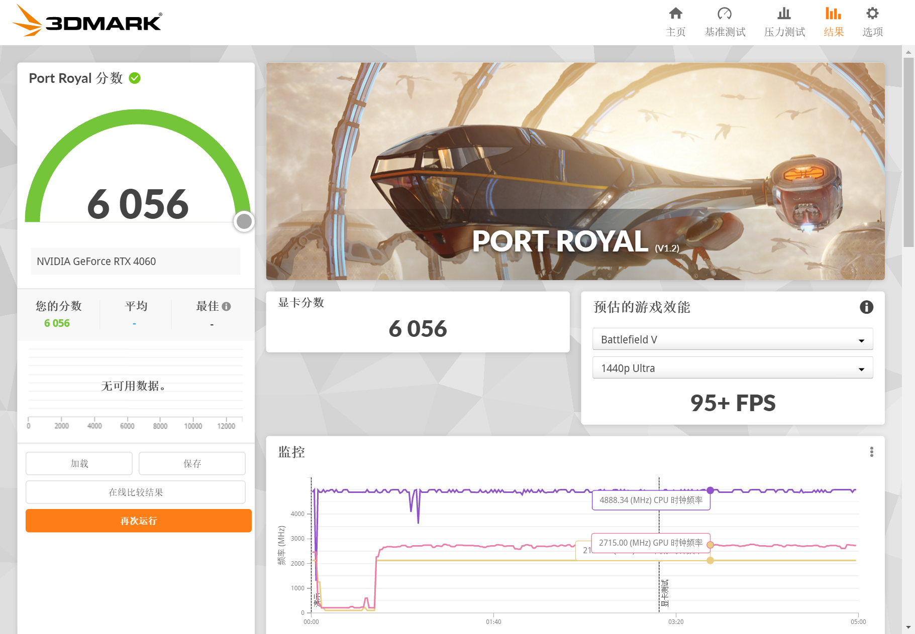 既然是RTX40系显卡,那就需要进行PortRoyal光追测试,COLORFIRERTX4060橘影橙8GB显卡的分数为6056分。