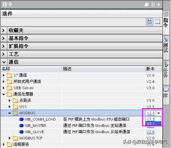 TIAV13SP1版本软件中提供了2个版本的ModbusRTU指令。如下图2所示: