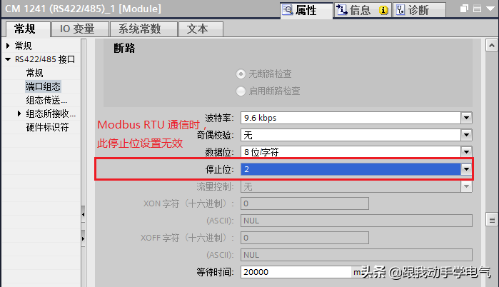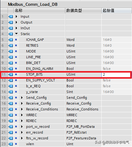 注意:S7-1200CM1241/CB1241属性里可以设置停止位,但是该模块用于Modbus通信时,此设置的停止位无效,需要在Modbus_Commload指令的背景DB里Static修改STOP_BITS停止位数值为2。如下图3,4所示: