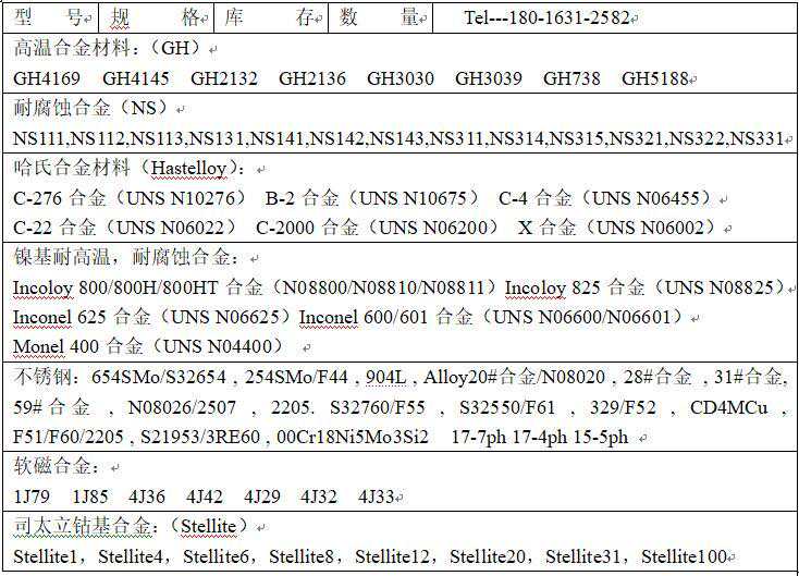 化学成分:镍Ni:余量铬Cr:0.4~0.7铁Fe:1.6~2.0碳C:0.01锰Mn:1.0硅Si:0.08铜Cu:0.5钼Mo:26.0~30.0钴Co:1.0磷P:0.02硫S:0.01