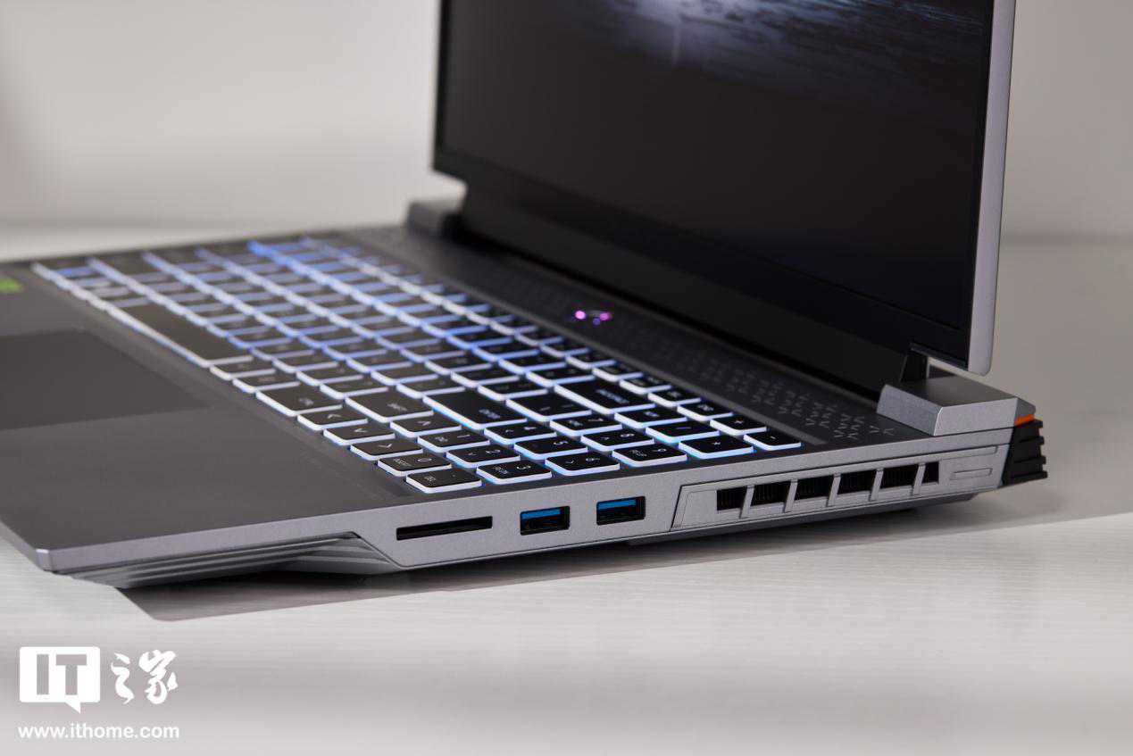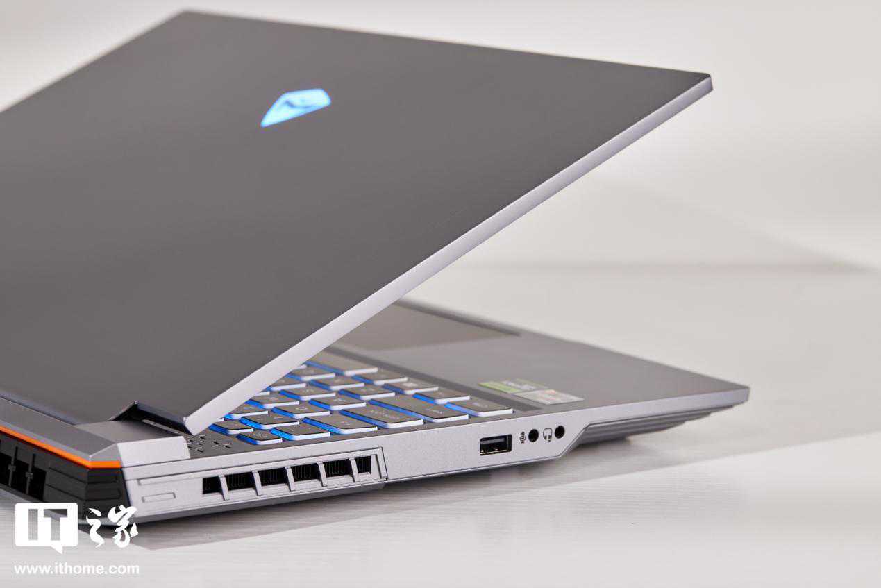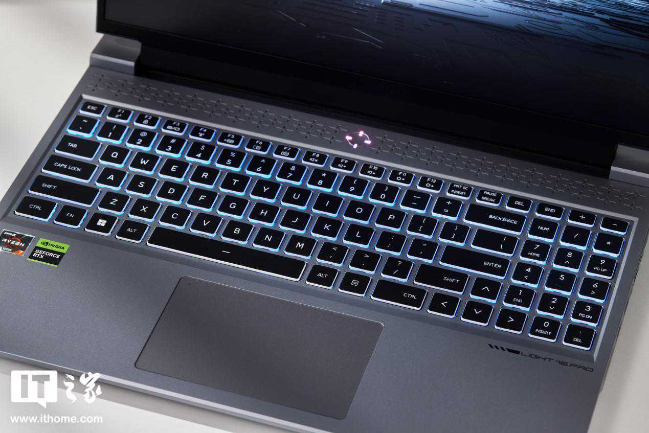 IT之家拿到的这款笔记本,主色调为灰色,A壳材质为航空铝轻材,并经过喷砂、阳极、氧化等工艺,给人带来成熟、不张扬的感觉。笔记本A面为纯平设计,没有掺杂太多线条与电竞图案元素,居中Logo支持RGB多色调节,另外还在机身右侧加入“Light16”产品型号标识,简洁的同时也让机身外观设计不像商务本那样稳重、单调。