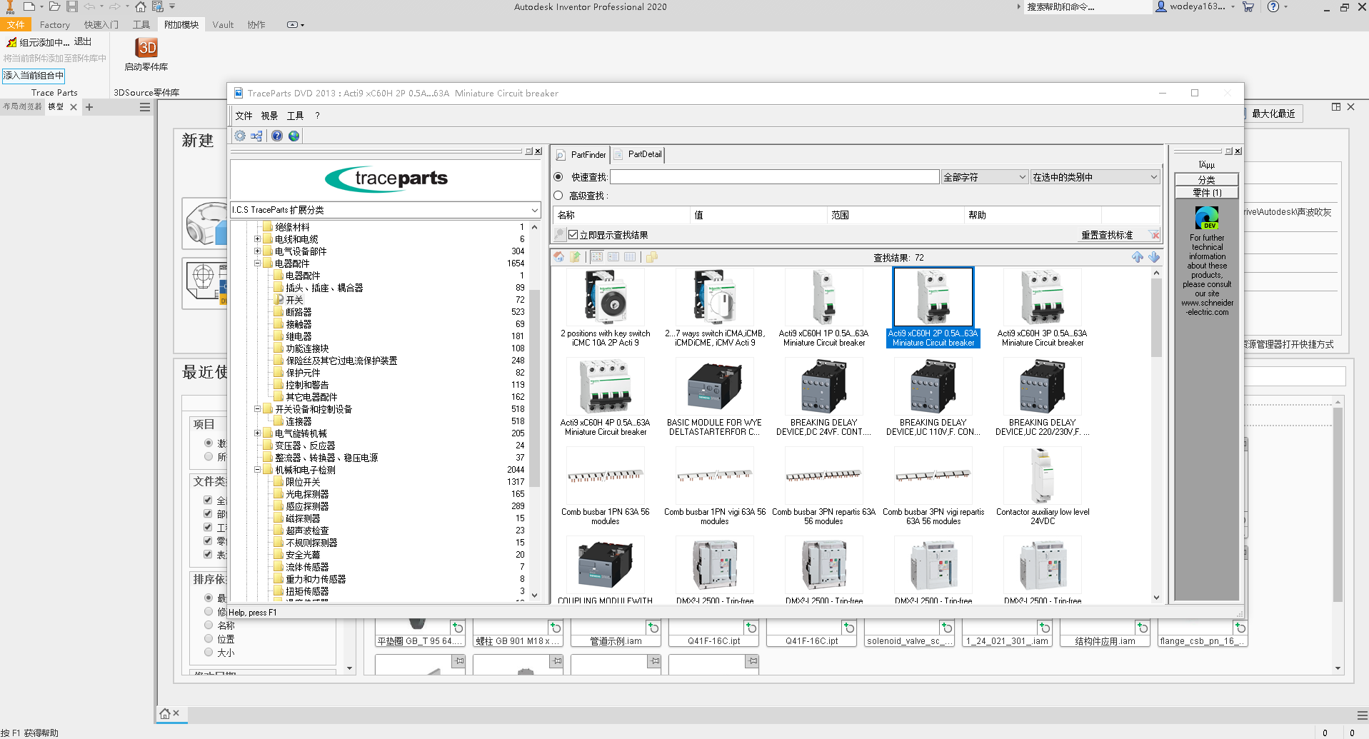 2、从icsTraceParts扩展分类下选择电气配件,我在这儿选择一个空气开关作为示例