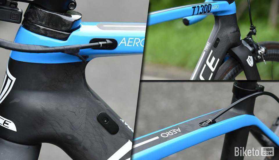 内走线设计将线管、电线隐藏于车架内,减少外露部分;T1300电线入口与刹车线入口相邻的设计,相比于机械、电子变速使用同一个入线孔的设计,外观更加简洁、美观;由于本次送测的T1300为ShimanoDi2内置电池式变速配置,下管上的机械变速走线均被妥善封盖。