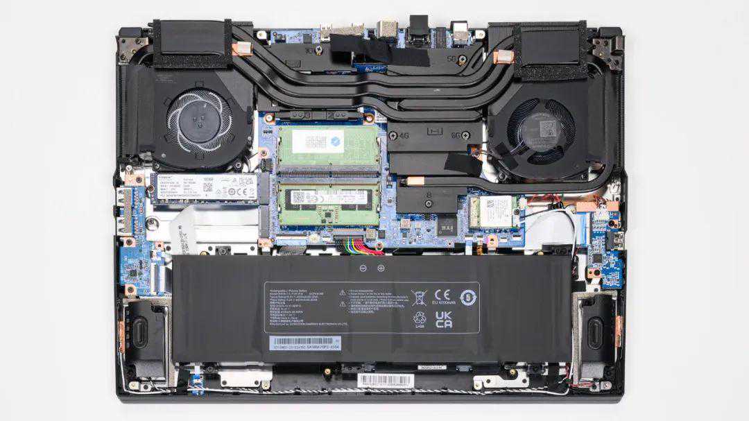 上图是机械革命蛟龙16S的拆机实拍图,5热管双风扇的组合,内部结构和先前的极光Pro等机型很相似。