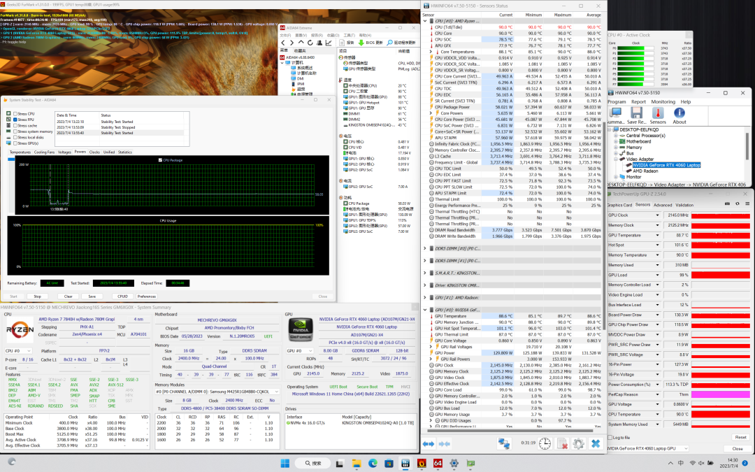 显卡功耗130W,温度88.6℃撞墙,频率2145MHz。