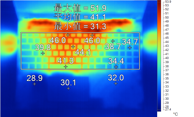 表面温度如上图所示,键盘键帽最高46℃出现在“F7”键上,WASD键附近约为40℃,方向键34.4℃。左腕托温度为28.9℃。