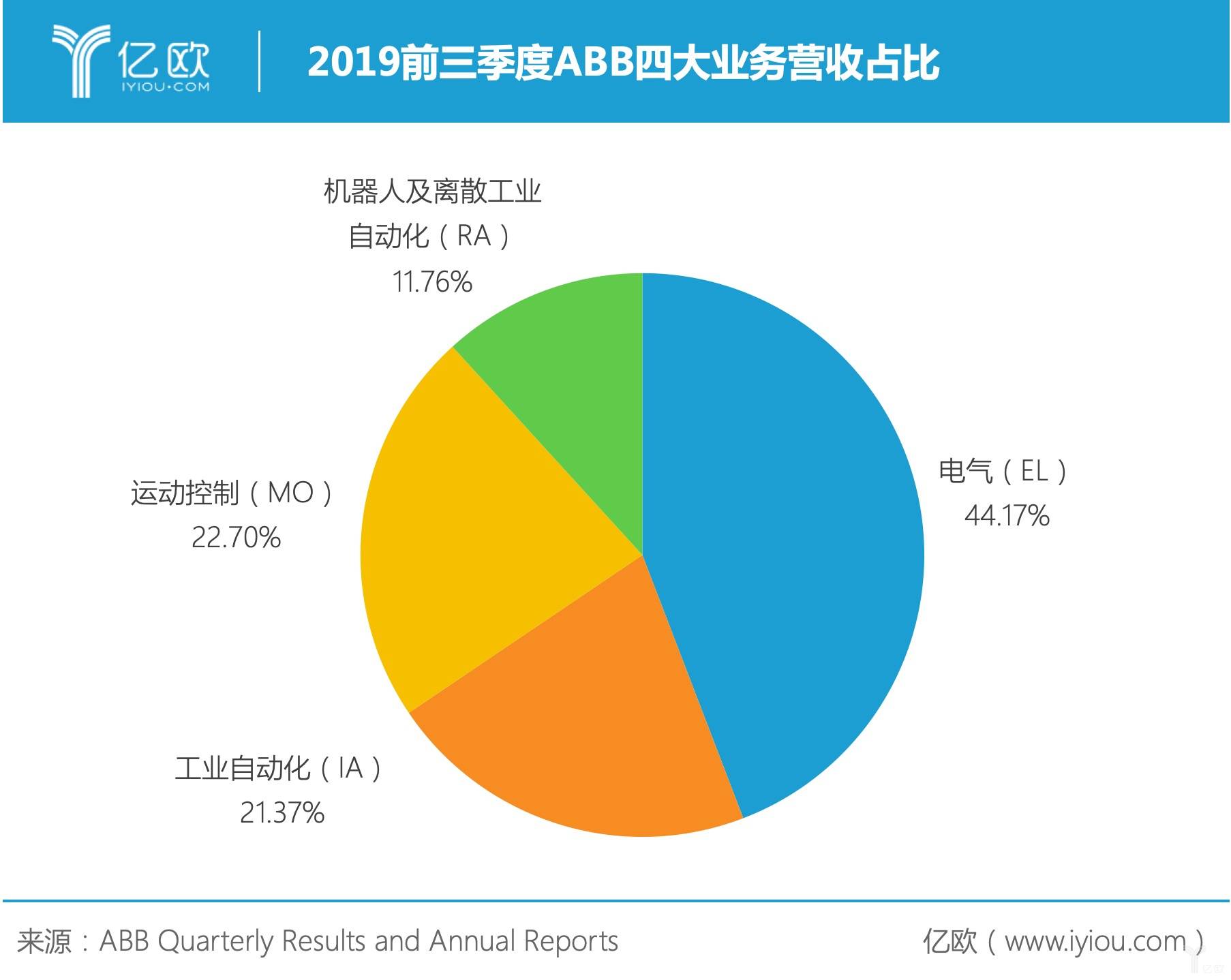 2019前三季度ABB四大业务营收占比(注:该图表统计未包含“CorporateandOther”项)