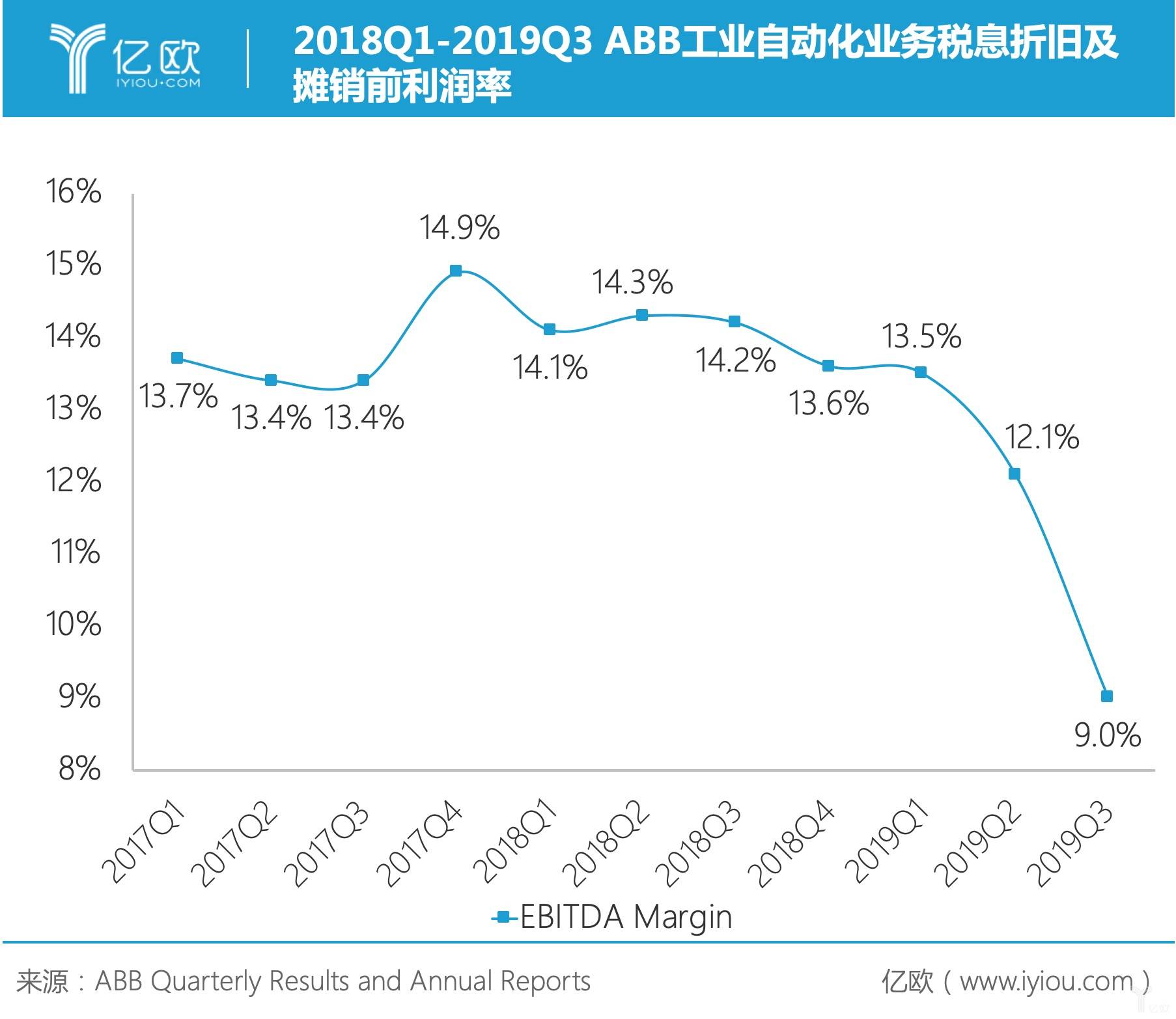 2018Q1-2019Q3ABB工业自动化业务税息折旧及摊销前利润率