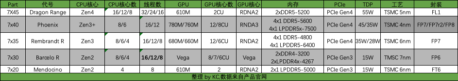 7x20系列,Mocino,6nm工艺Zen2+2CU,仅2x的DDR5规格,面向入门级市场