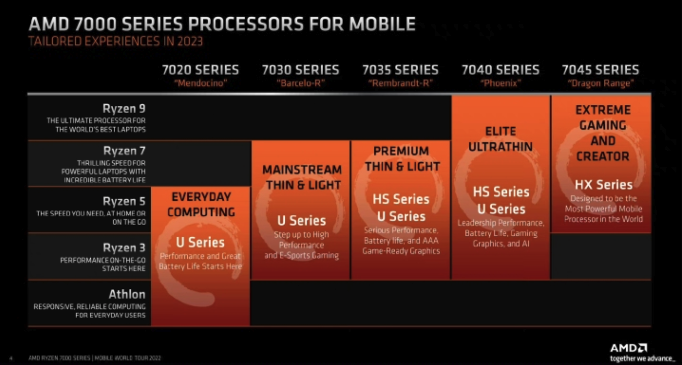 第1位数,代表产品定位,数字越大代表定位越高。(明眼人一定会发现这里的问题,同样的数字去比,比如7520U和7335U,从定位上来看7520U更高,但性能上真的如此吗?7520U是4核心8线程Zen2加上2CURDNA2GPU、2xLPDDR5内存,而7335U是4核心8线程Zen3+6CURDNA2GPU、4xDDR5/LPDDR5内存,显然是7335U要强的多。这个问题会让消费者面对7000以及后续的产品时,遇到非常多的类似的问题,极度不友好。)