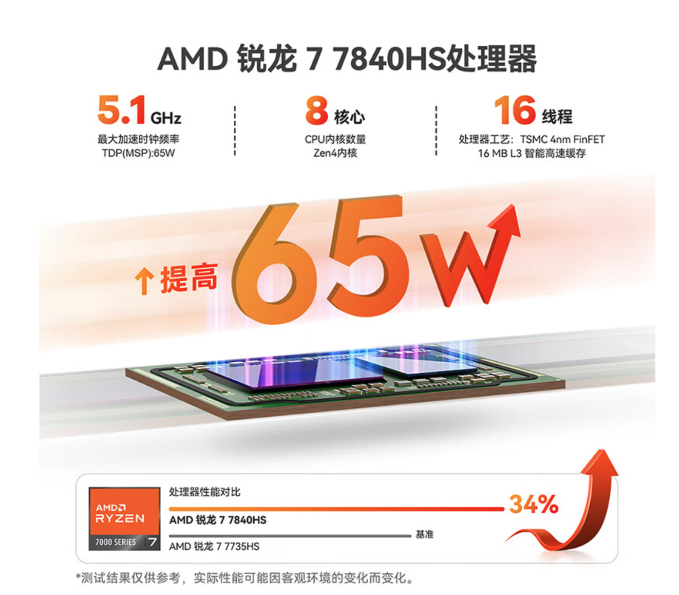 由于AMD的(制程更先进,晶体管密度大)核心更小,Zen系列产品的积热其实已经是老生常谈了,即使相同规格的散热模组核心温度也明显是高于Intel的。作为迷你主机,其实对功耗相对不那么敏感,这次吧R7-7840HS的TDP拉到了65W,官方数据对CB全核有10%的提升,同时应该会缓解AMDCPU+GPU抢电(功耗)的问题。