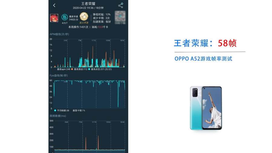 因为游戏的限制,《王者荣耀》只能开启高分辨率,其余特效全开。软件记录的平均帧率为58帧,和记录的结果一样,游戏全程都能保证很好的流畅度,一些比较复杂的团战环境也能轻松应对,游戏体验很好。机身整体的发热控制得也比较好,即使进行比较长时间的游戏也不会有明显烫手的感觉。