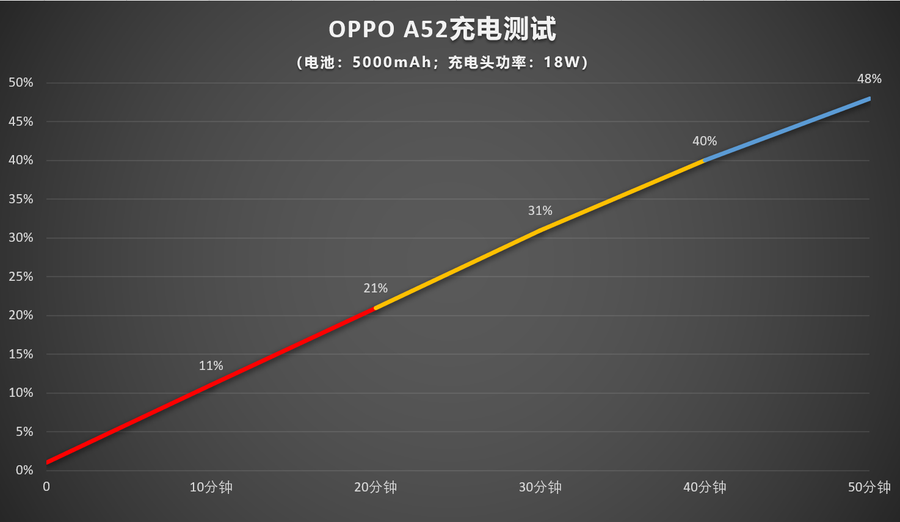 在充电方面,笔者在OPPOA52电量剩余1%的时候,使用原装充电器对其进行充电测试。根据实测结果,30分钟即可充电到31%,50分钟可充电到48%,对于一款搭载了5000mAh大容量电池的千元机来说,这样的表现也是可以接受的。