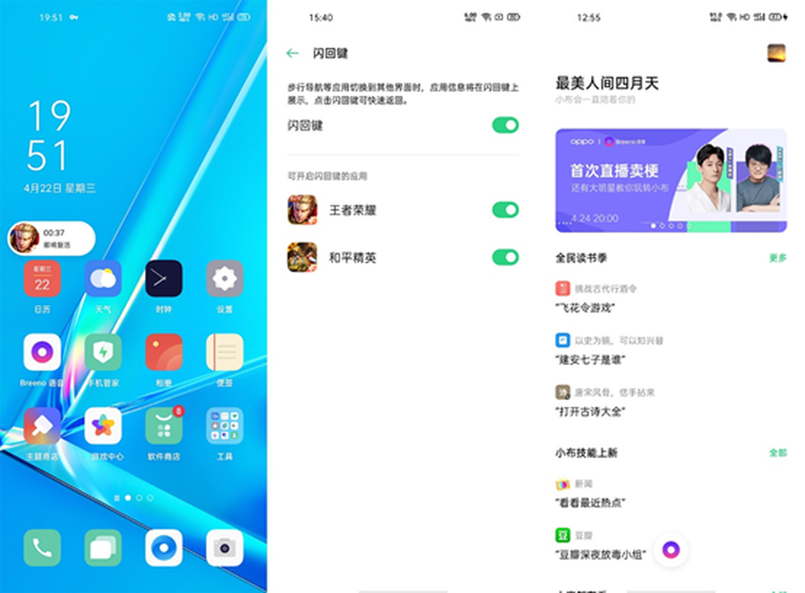 此外,系统还针对动画进行优化,结合物理加速度,系统动画的表现更加真实自然,在细节处给用户更加贴心的体验。还拥有许多丰富实用的小功能,通过闪回键可以在桌面显示游戏倒计时,一键切换回游戏,目前已支持《王者荣耀》、《和平精英》两款游戏。另外还有更智能的Breeno助手等,都能提升交互体验和操作效率,让OPPOA52的综合体验更加优秀。