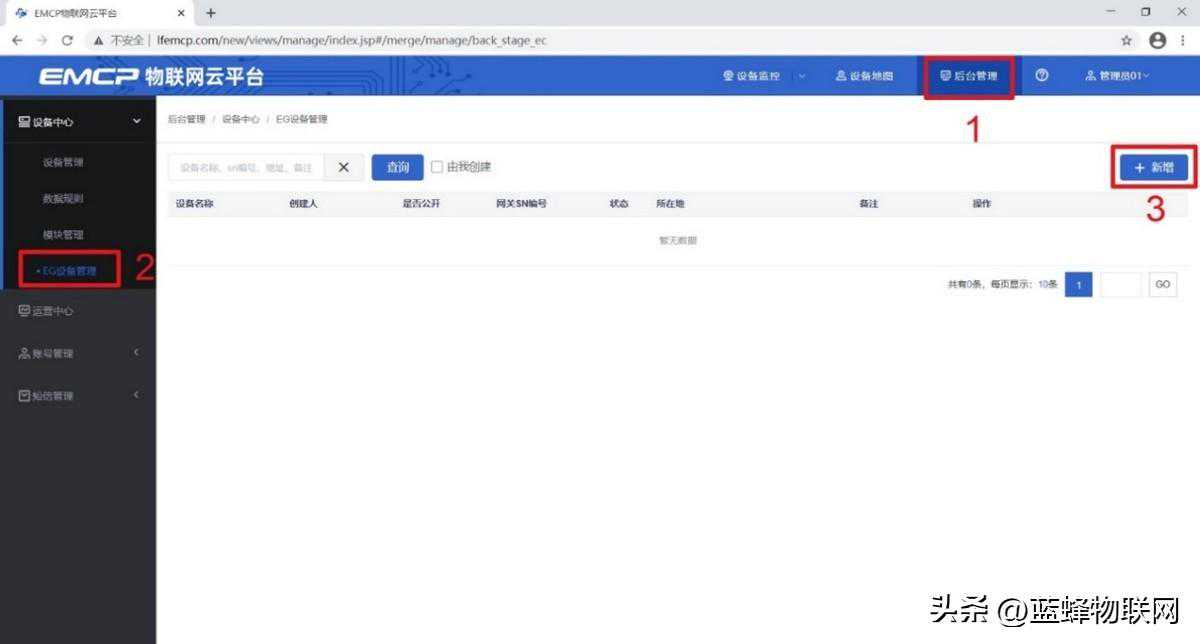 用管理员账号登录EMCP平台(建议使用360浏览器极速模式、谷歌浏览器(GoogleChrome)或者支持Chromium内核的浏览器),对EMCP云平台进行设置。登录EMCP后首先进入设备列表显示页面,因为我们未创建任何设备,所以是一个空页面。