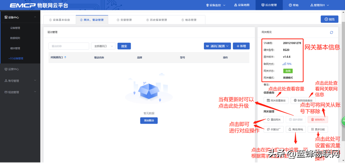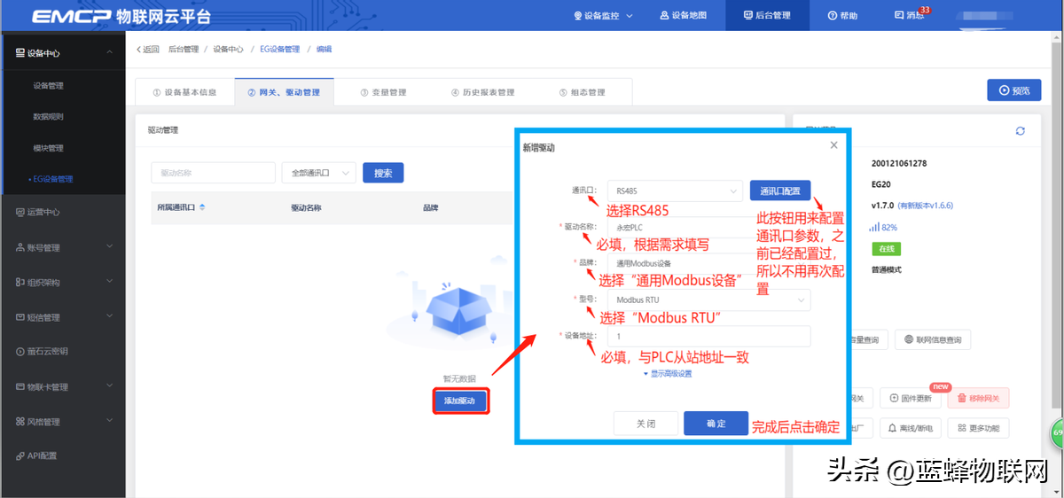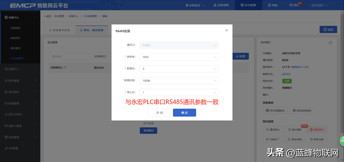 远程配置最主要两个地方需要配置,一是配置网关485通讯参数,二是在平台上创建和永宏PLC通讯的Modbus设备驱动,下面分步骤对此功能进行讲解。注:网关只有在线后才可以进行远程配置。