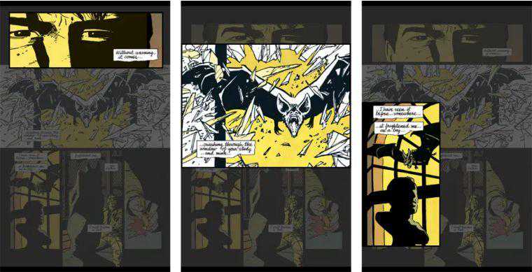 在分格或页面切换中加入动画效果通常出于两个目的,第一是为了解决之前提到的字体大小和画面密度问题。智能手机和平板电脑的屏幕比起正常的书页偏小,在这些设备上阅读漫画时相信很多人都有看不清文字的苦恼。