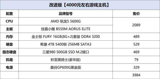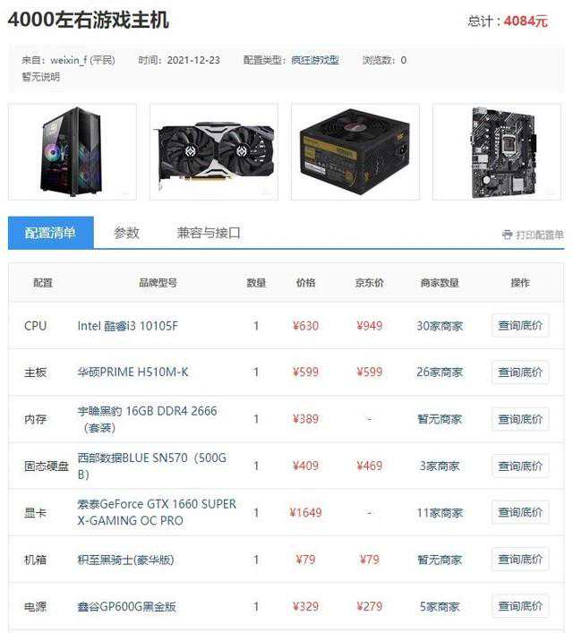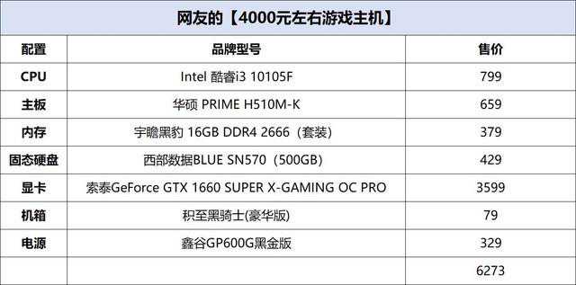 这名网友的配置主题为【4000元左右游戏主机】,由于产品库的实时价格与电商略有出入,下面笔者从京东按照相同配置整理了一份价格。
