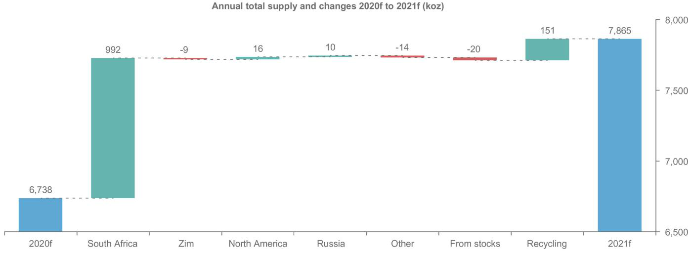 初步预测显示,2021年铂金供应总量将在2020年的基础上增长17%,达到786.5万盎司。预计精炼产量回升21%,回收供应量反弹8%,推动了铂金供应的复苏。由于预计ACP转炉厂将于1月重新投入运行,以及在2020年因疫情而削减产量之后矿山生产将完全恢复产能,因此,南非占据了预期产量复苏的一大部分。