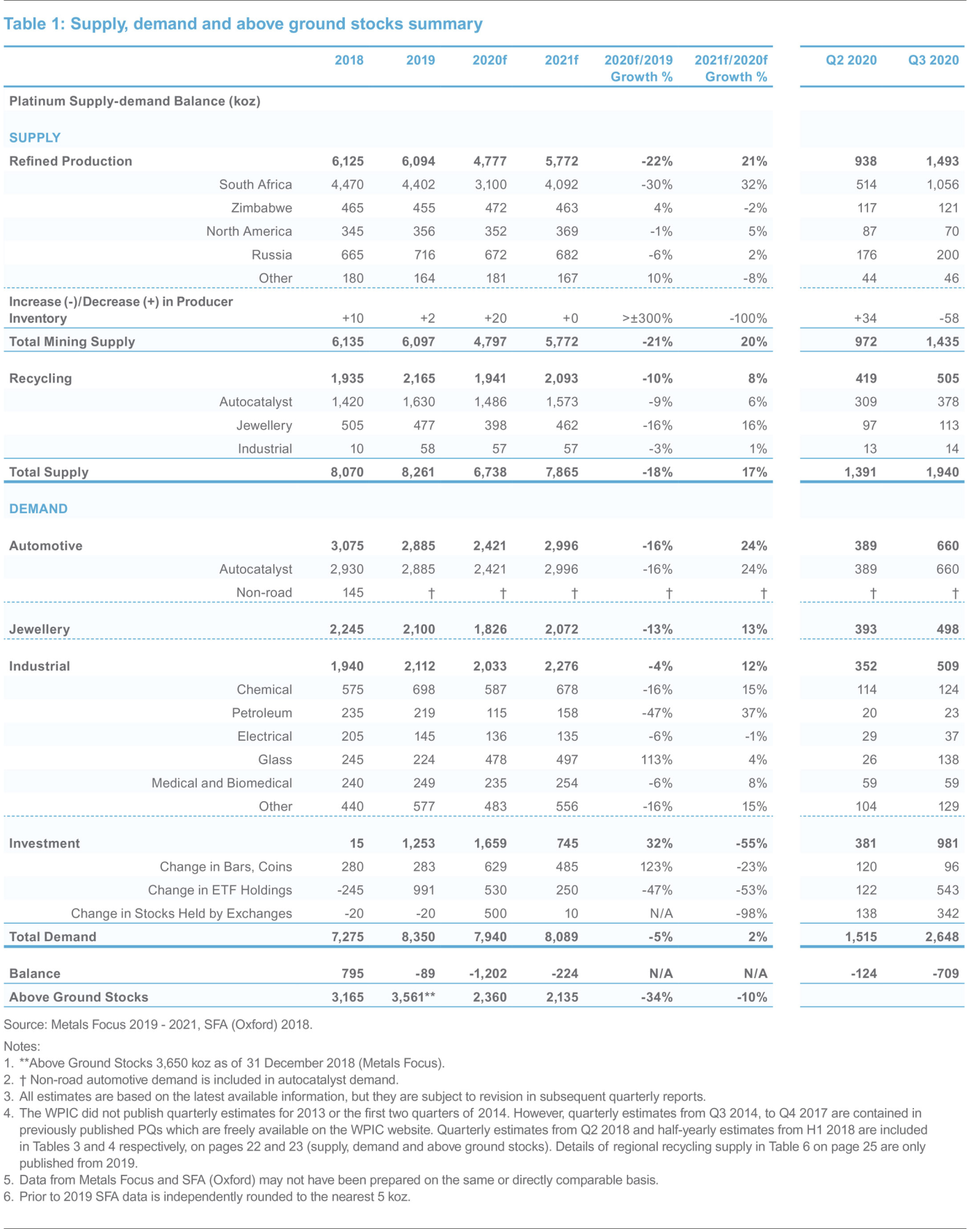 2020年铂金供应预期较之前的预测大幅下调。预计2020年的矿产总供应量将同比下降21%或-130万盎司,其中大约40万盎司是由于与新冠疫情相关的矿山停产造成的,约-90万盎司是由于上半年转炉厂停产的影响,叠加最近宣布在2020年最后两个月的类似停产。仅最新的停产就将导致今年供应量减少约-35万盎司。