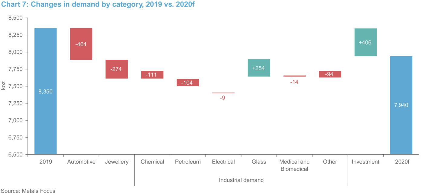 与供应相比,由于投资需求的显著增长缓冲了其他需求的下降,因此总需求下降的幅度要低一些。预计今年铂金总需求将下降5%(-41万盎司),其中汽车需求下降16%(-46.4万盎司),首饰需求下降13%(-27.4万盎司),工业需求下降4%(-7.9万盎司)。尽管ETF需求预测将比2019年下降47%(-46.1万盎司),但预计铂金条和铂金币的需求将强劲增长123%(+34.7万盎司)及52万盎司铂金流入交易所(主要是芝加哥商品交易所的交割仓库)库存,所以预计投资总需求将增长32%(+40.6万盎司)。