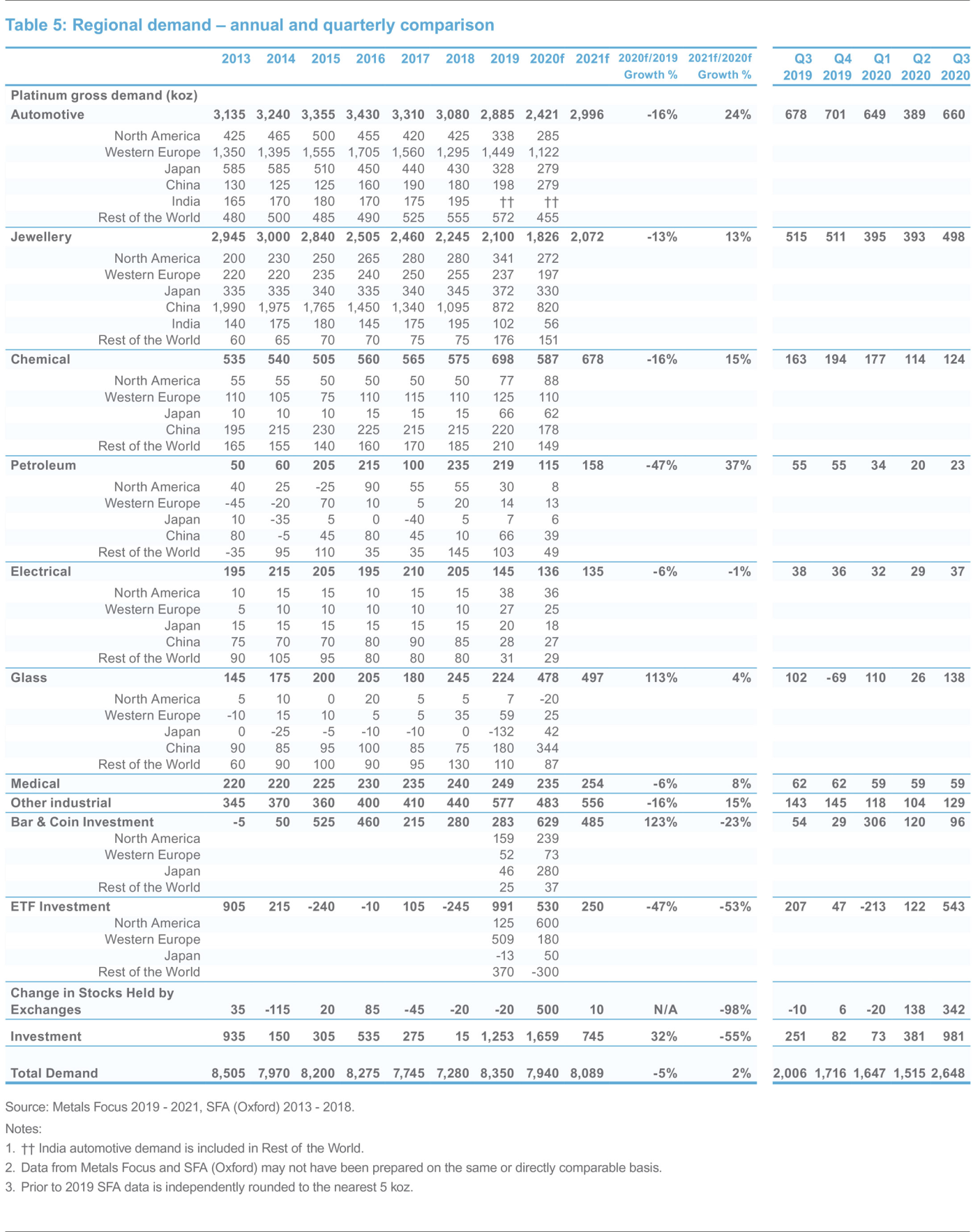 汽车需求在严厉的封锁期之后,LMC汽车报告说轻型车销量已经反弹,全球季节性调整的年化率在7月和8月恢复到疫情前约8900万辆的水平。这种反弹得益于压抑的汽车需求和欧洲等地区的激励措施,这些因素推动了库存补充的需求。因此,全球汽车产量回升至仅比2019年第三季度低2%,而2020年第二季度产量同比下降43%。尽管销量和产量都出现了明显的反弹,但汽车行业的铂金总需求同比下降了3%(1.7万盎司)。