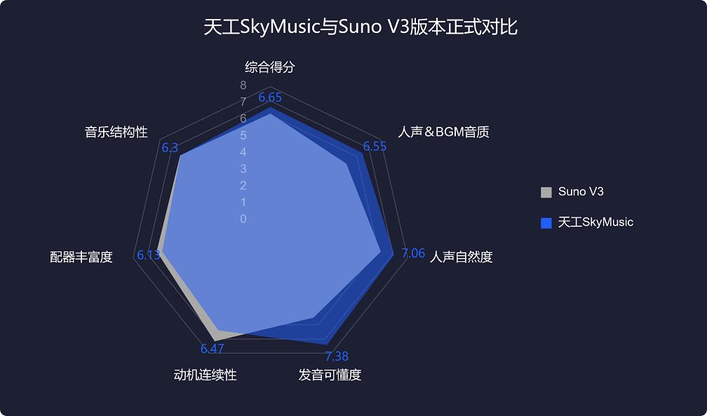 事实上,根据官方数据,在人声和BGM音质、人声自然度、发音可懂度等几个指标上,「天工SkyMusic」的综合性能都超越「SunoV3」,成为最新音乐AIGC的SOTA模型,让中国的自研大模型技术第一次在AIGC领域领跑全球。