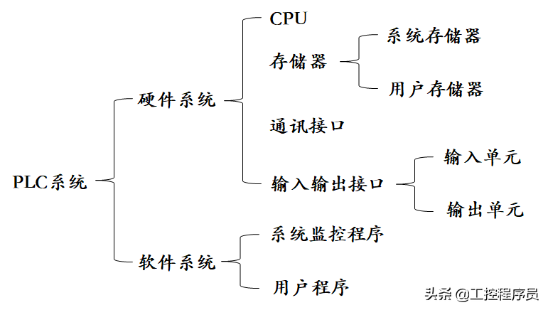 PLC由软件系统和硬件系统组成。其中硬件系统由CPU、存储器、通讯接口、输入输出端口组成,软件系统由系统程序和用户程序组成。